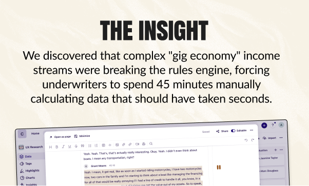 I conducted 12 hours of deep-dive shadowing with the underwriting team. I pulled up a chair next to the Lead Underwriter and simply watched her work.